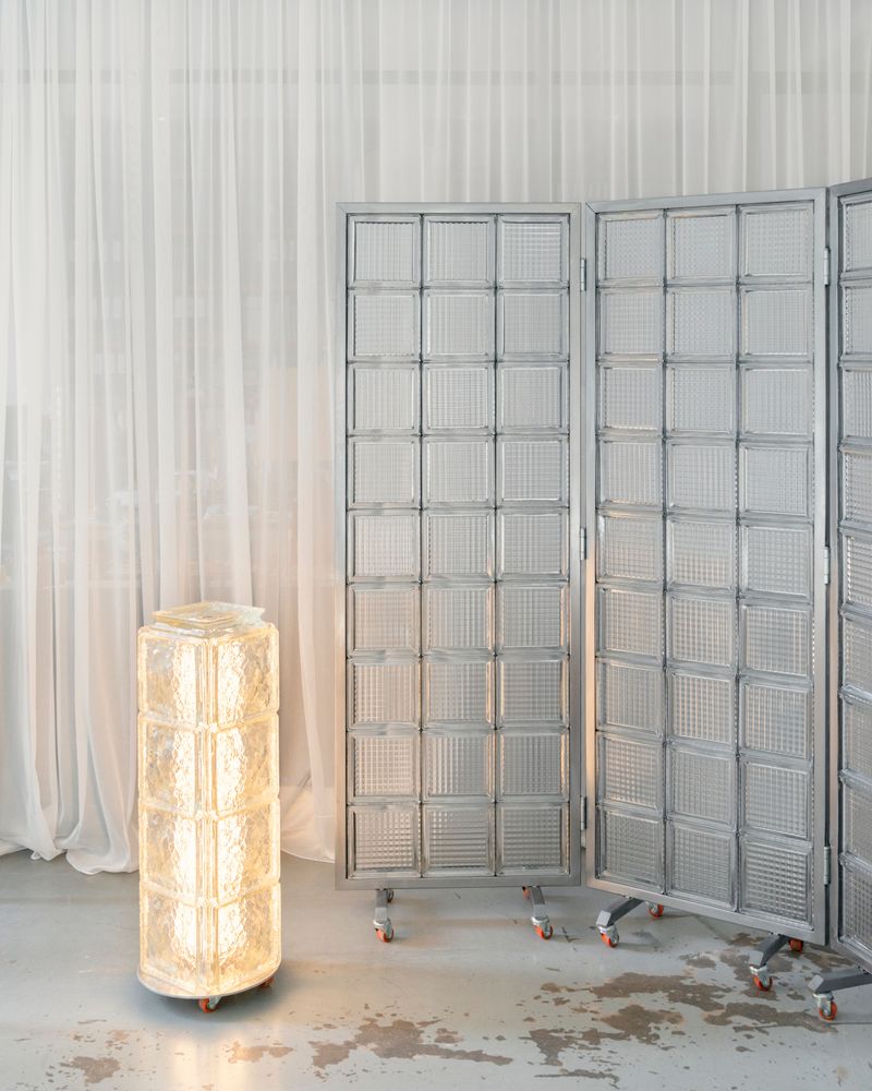 Light "Gisèle" Direct lighting Glass blocks made in France “Le Corbusier” model reedition Aluminum frame and LEDs on wheels Height 800 mm Diameter 300 mm Weight: 50 kg Led lighting Prototype not sold Pre-order on final version available early 2025 Delay 6 weeks excluding delivery Price on request Delivery 🚚 world. Price according to destination