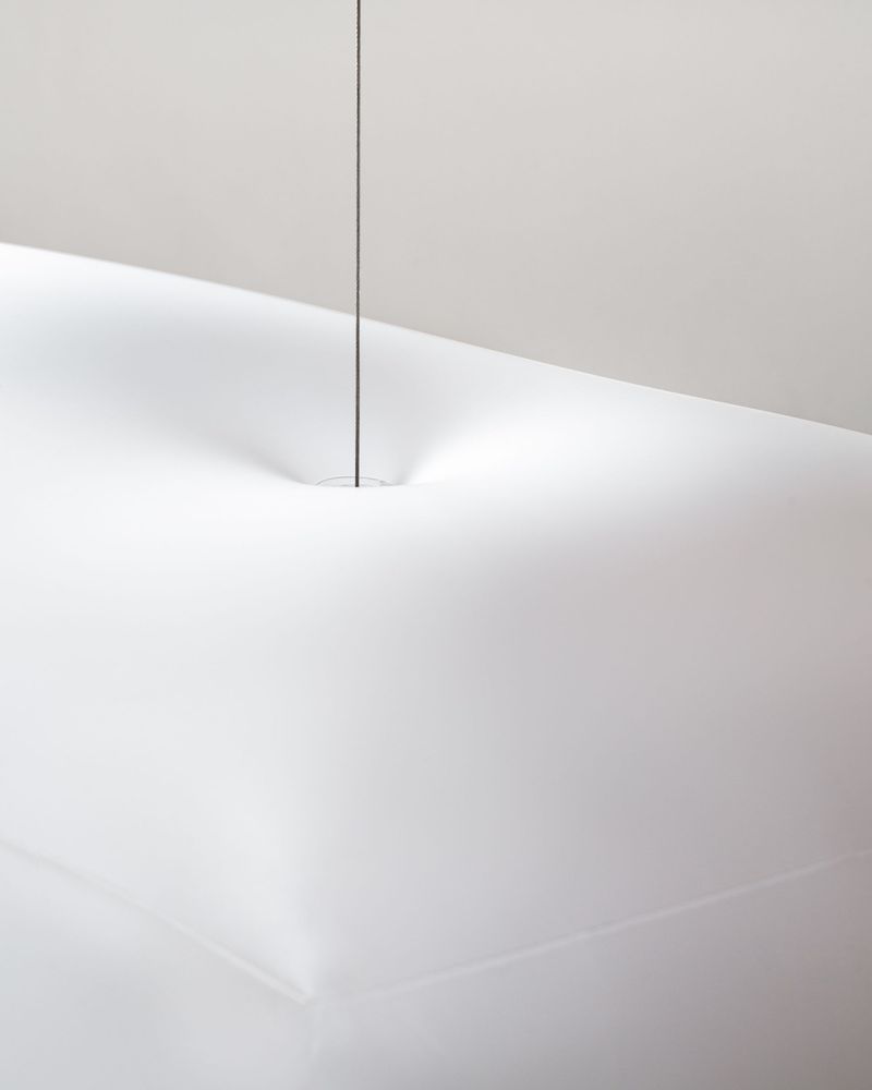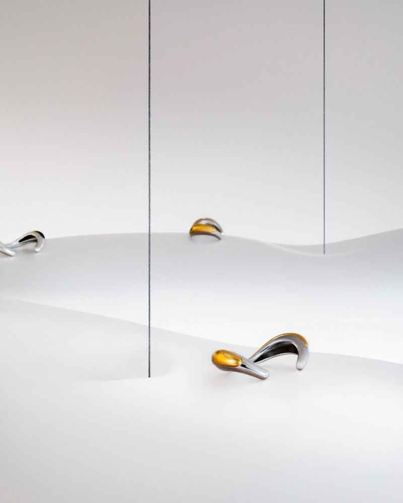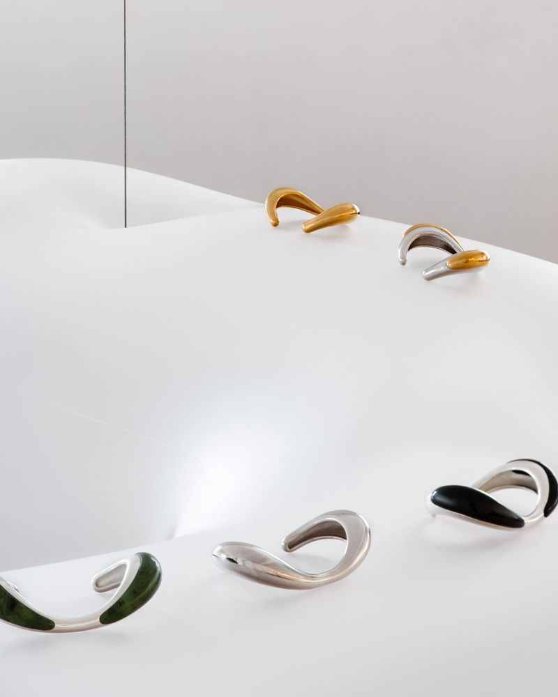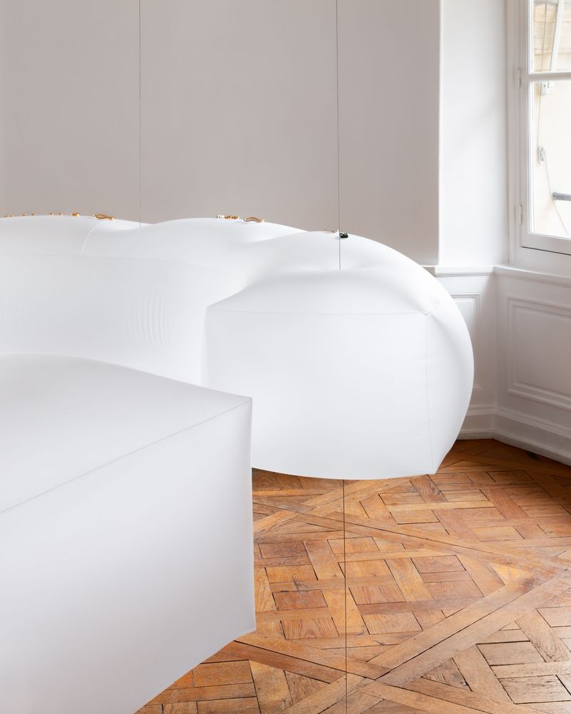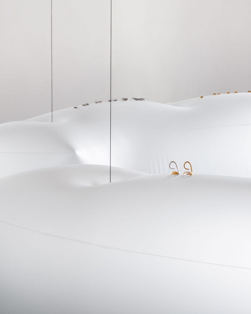 "ICONIC BLOW" A space merging jewelry and weightlessness for Charlotte Chesnais, showroom , 2025 With Constant Clesse. PU displays inflated with helium, steel cable , aluminium blocker. Crédits photos Luc Borho